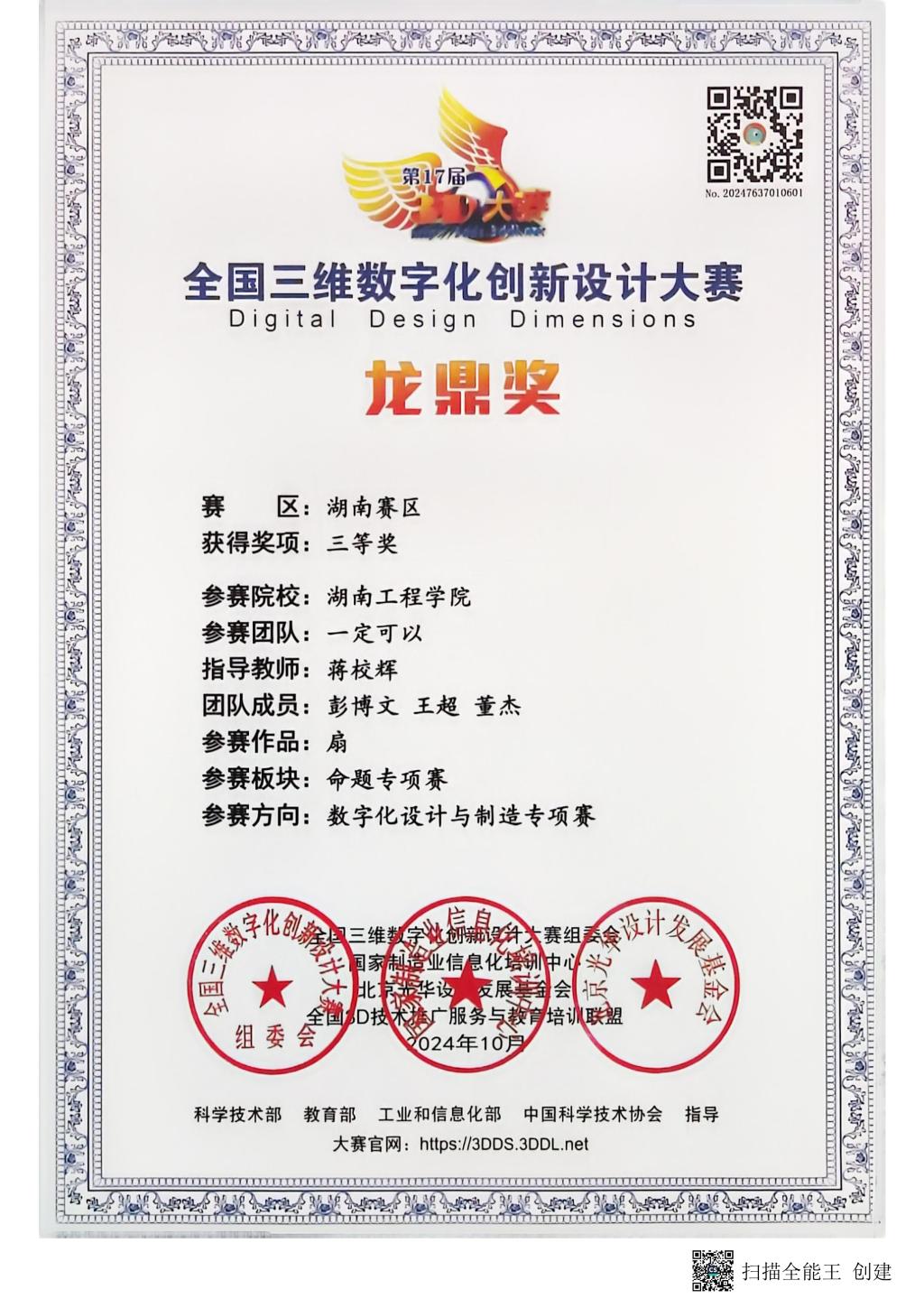 全国三维数字化创新设计大赛“龙鼎奖”湖南赛区三等奖